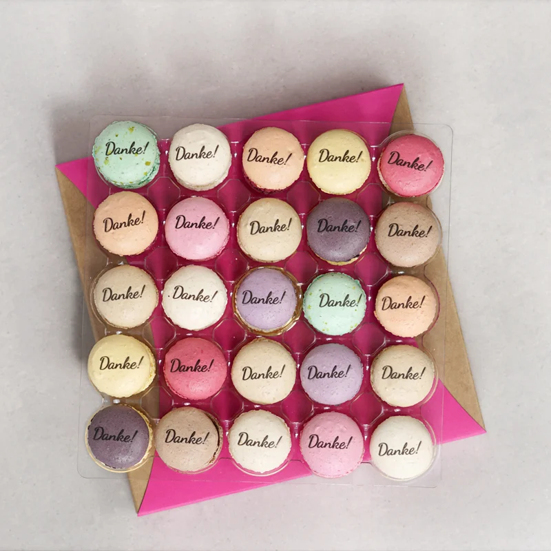 Es gibt Momente, da möchte man einfach mal Danke sagen. Und manchmal am liebsten gleich 25 mal. Hintereinander! Zum Glück, gibt es dazu unserer bunt gemischte Geschenkbox mit „Danke“ auf den leckeren Makrönchen. PS: Und falls 25 Danke doch noch nicht ganz ausreichen, kannst Du einfach noch ein paar extra „Danke, Danke, Danke!“ auf die persönliche Grußkarte schreiben 😉